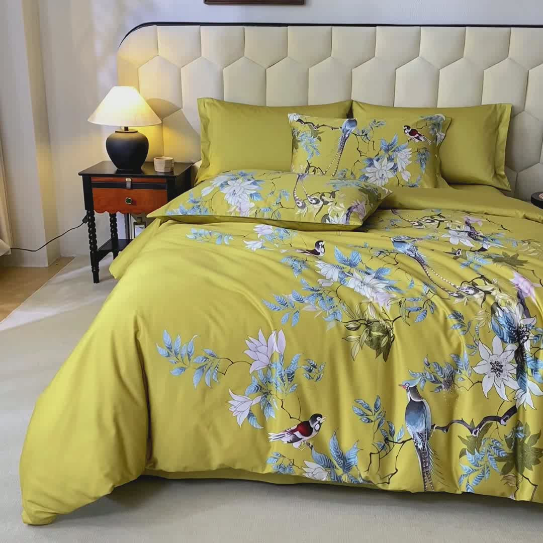 Unlike the original version with a contrasting back, this updated design is all gold, top to bottom. The rich mustard tone and subtle sheen pair beautifully with the graceful bird print, creating an effortlessly luxurious look for any bedroom.