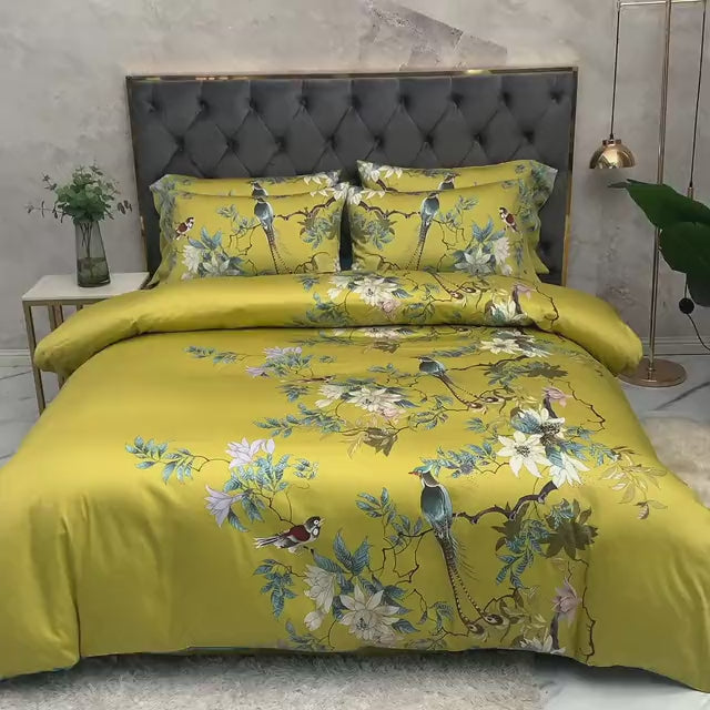 Golden Birds is bold, warm, and full of elegant detail. The golden yellow base sets a rich tone, decorated with detailed birds perched on winding branches among soft white and pale purple flowers. A deep teal reverse adds depth and contrast, keeping the look grounded. Made from silky Egyptian cotton with a sateen finish, this set combines standout color with refined comfort.